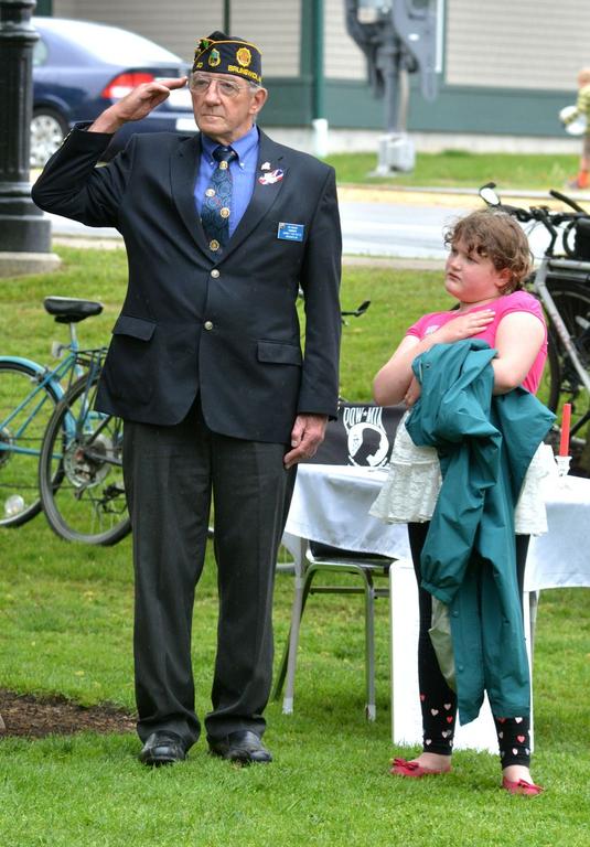 Joe Donahue, American Legion Post 20 commander and a retired U.S. Navy senior chief, of Brunswick, salutes with his granddaughter, Arianna Neuts, 8, of Freeport, during the National Anthem at the Memorial Day ceremony in Brunswick. (Roger S. Duncan / For The Forecaster)