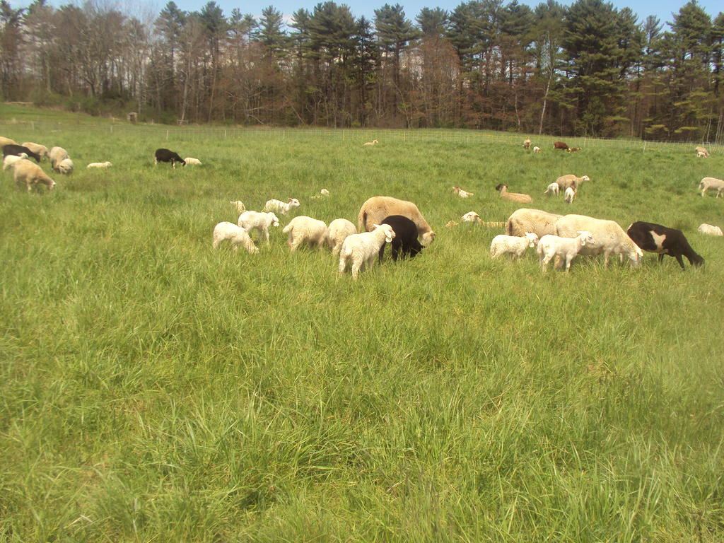 Lambs don’t stray too far from their mothers while grazing on spring grass at Wolfe’s Neck Farm in Freeport.