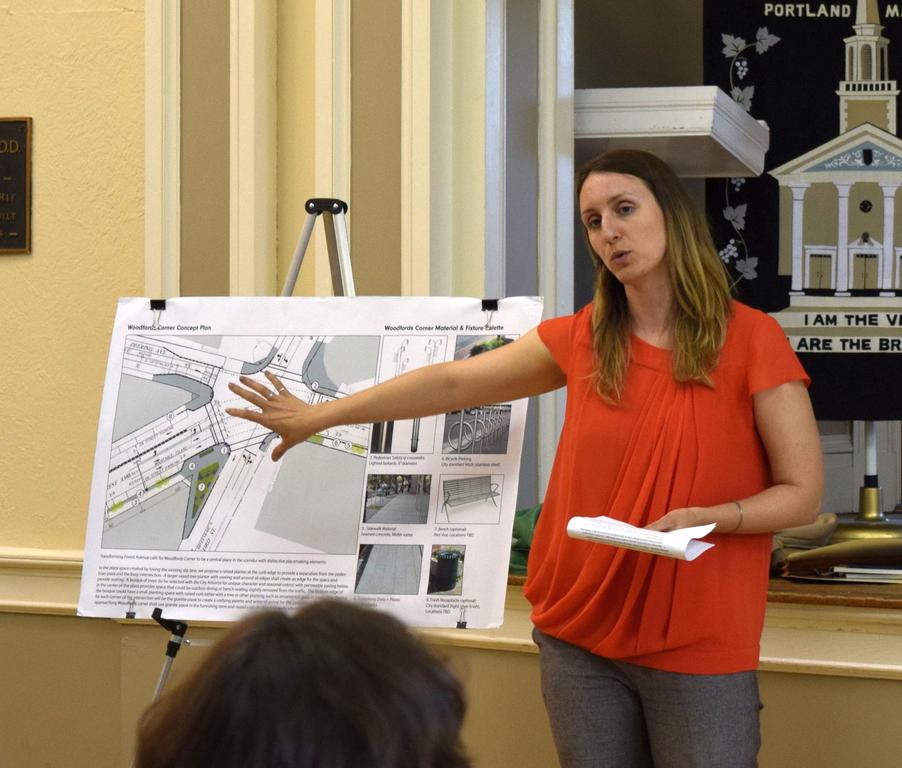 Portland Urban Designer Caitlyn Cameron reviews plans to create a plaza at Woodford Street and Forest Avenue during a June 1 meeting at Woodfords Congregational Church.