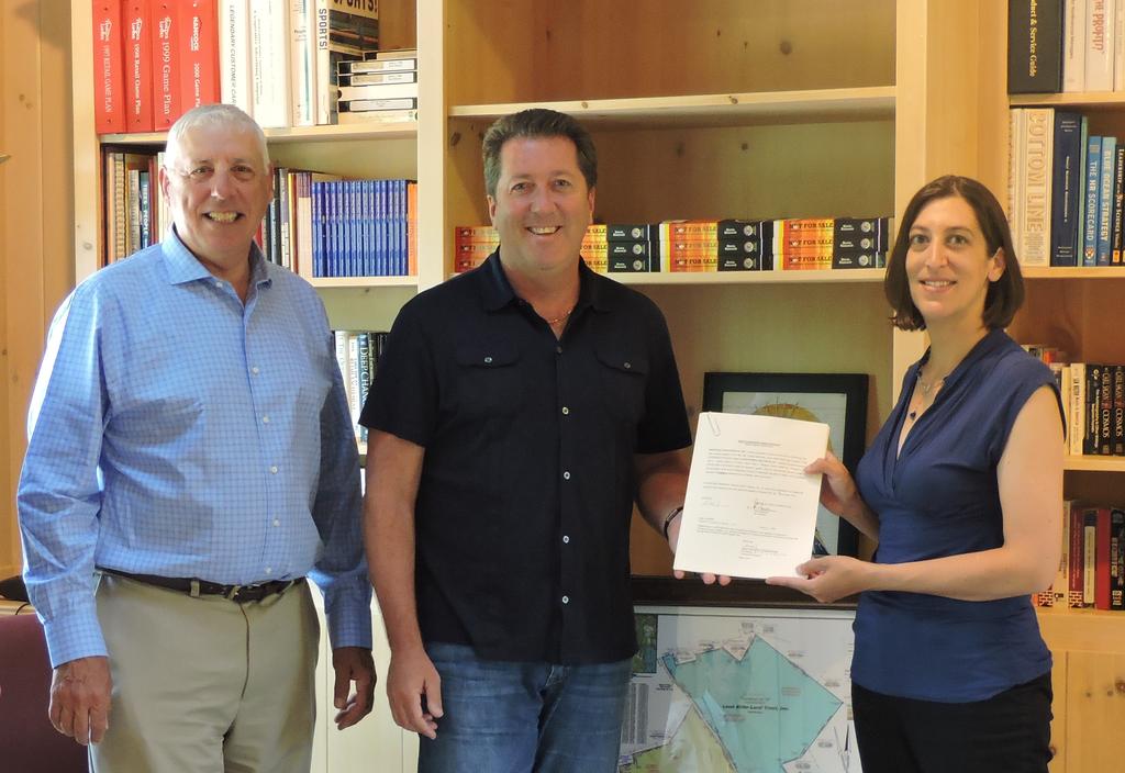 Executive Director Thom Perkins, left, stands with Kevin Hancock and Carrie Walia after signing the deed for Raymond Community Forest.