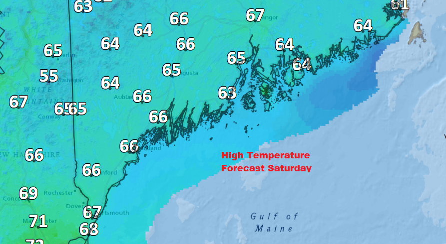 High tides will be occurring between 10 and 11 this weekend in most areas Water temperatures are still chilly low 60s or 50s as you move north along the Maine coast.