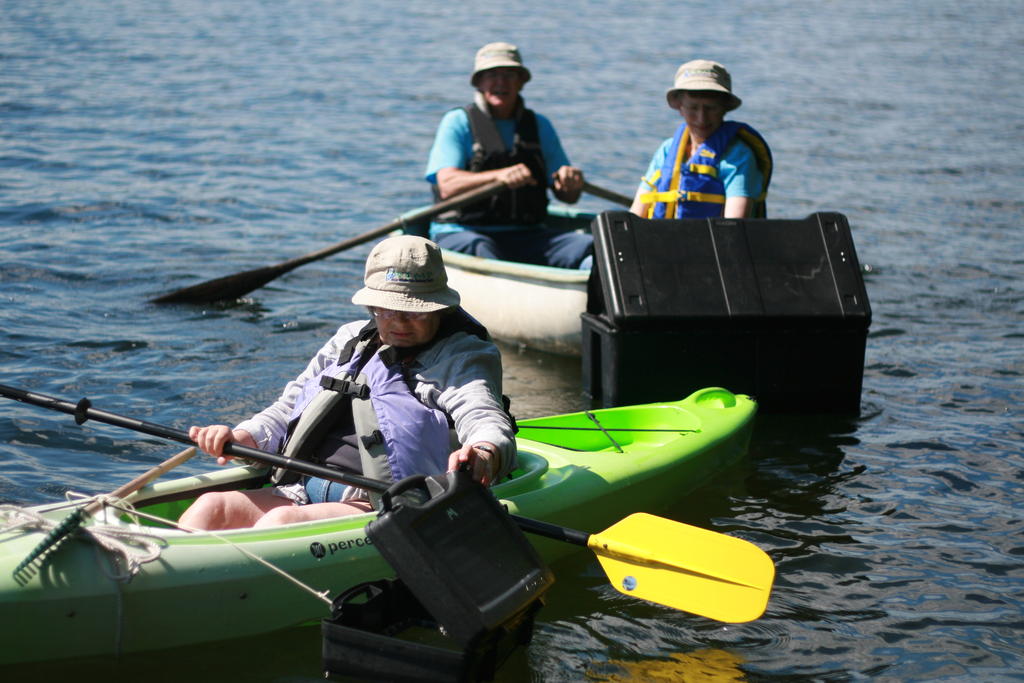Bunny Wescott, front, and Sibyl French check Panther Pond for invasive plants using a tool designed by Wescott’s husband, Ross Wescott. The plastic trunk with a plexi-glass window cut in the bottom smooths out ripples on the water, allowing them to see more clearly to the bottom of the pond.