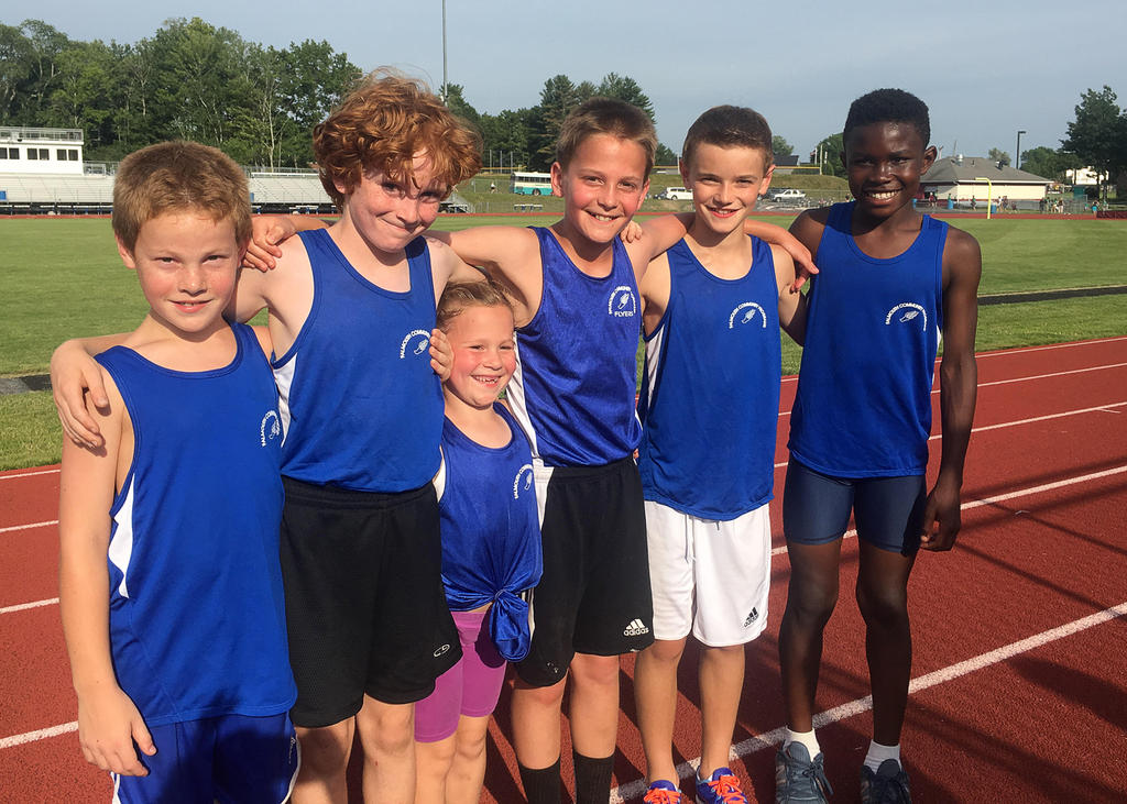 Because Freeport doesn’t have its own track and field complex, these area athletes have to compete for Falmouth in the summer. From left: Dietrich Schulz, Henry Horn, Payton Schulz, Logan Schulz, Jordan Knighton, Frank Morang. The Schulzes are from Pownal, Horn is from Durham and Knighton and Morang are from Freeport. Not pictured: Macy Johnson.