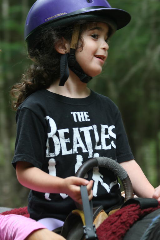 The girls practiced grasping the reins with their left hands, and reaching with their left arm while playing games with the volunteers. Later in the session, the girls left the arena and trotted, escorted by volunteers, along a wooded outdoor path.
