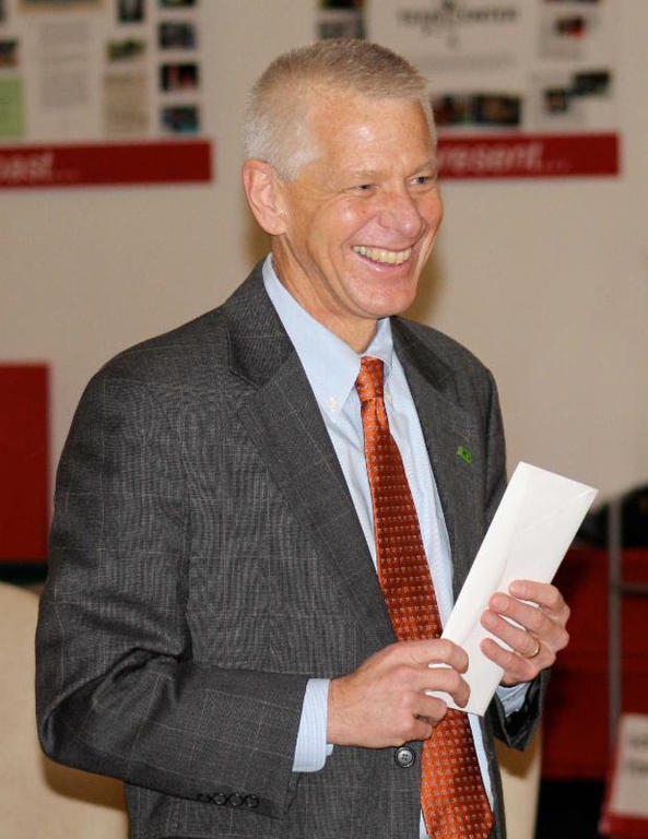 Larry Wold, the president of TD Bank, presents a check for $30,000 to My Place Teen Center earlier this year during an announcement event.