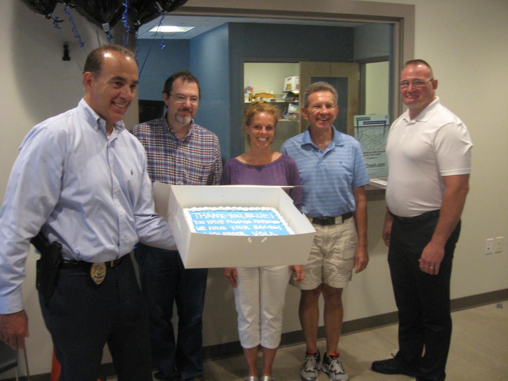 In an an appreciative gesture Monday, citizens surprise Gorham Police Department with a cake, cards and balloons at the station. Republican legislative candidates Matt Mattingly, Sen. Amy Volk of Scarborough, and Jim Means present a cake to Chief Dan Jones, left, and Deputy Chief Chris Sanborn, right. Gorham residents Joan and Norman Pelletier, not pictured, gave cards to the officers. In the November election, Volk, an incumbent, is running against Democrat Jean-Marie Caterina of Scarborough in Senate District 30; Means is challenging Rep. Andrew McLean, D-Gorham, in House District 27; and in House District 26, Mattingly is facing Maureen Fitzgerald Terry of Gorham, a Democrat.