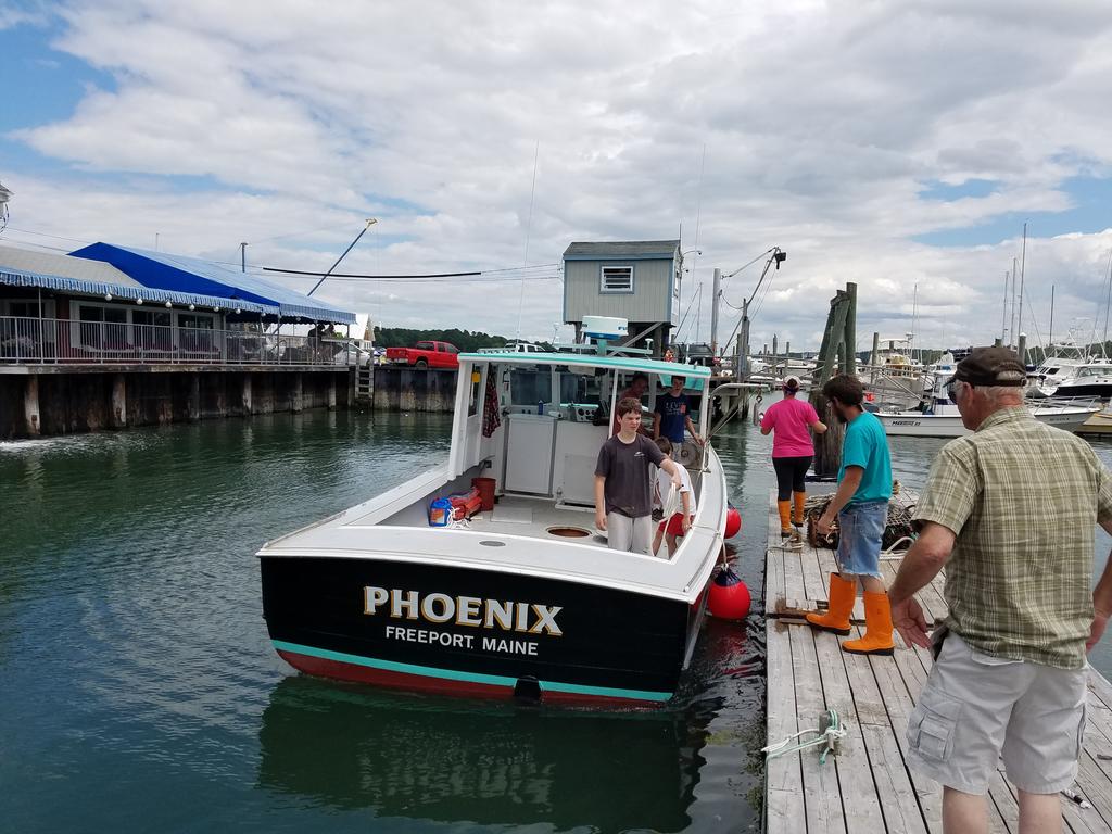 Tommy Coffin, 15, stands in his new lobster boat, The Phoenix, the latest addition to the town wharf on the Harraseeket River in Freeport.