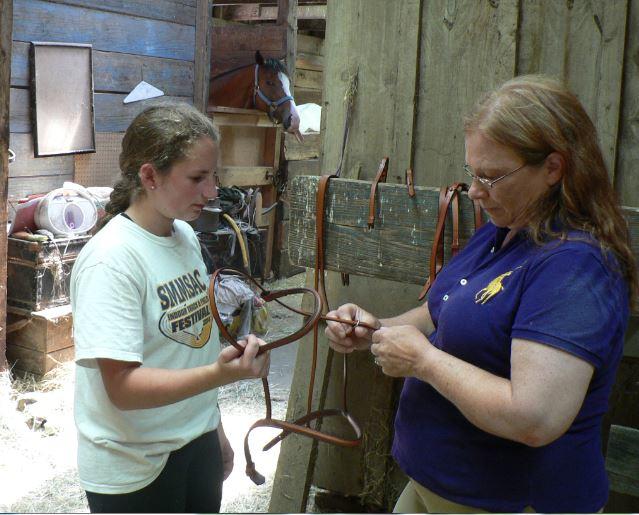 Diane Kane shows riding student Gina Carbone how to properly handle a piece of tackle.