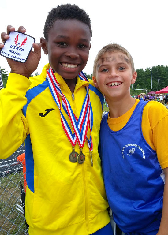 The USA Track and Field Maine Youth Championship unfolded at Cony High School in Augusta on Saturday, Aug. 13. More than 1,200 athletes toughed out rainy conditions to take part, with frequent headliner Frank Morang, 12, of Freeport among them. Morang, seen here with his best friend, Keigan Shea, also of Freeport, qualified for six events, but because of his age grouping (Morang is 12), was only allowed to compete in three. Morang chose the 100, 200 and Long Jump, winning all three and setting a new state record (13.25) in the 100.