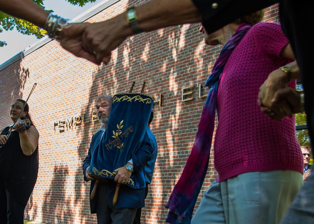Community members dance to celebrate Shaarey Tphiloh synagogue’s new home at Temple Beth El on Deering Avenue in Portland on Sunday, Aug. 21, while Rabbi Gary Berenson of Etz Chaim Synagogue holds a torah carried from the deconsecrated Noyes Street synagogue. (Dan D’Ippolito / For The Forecaster)