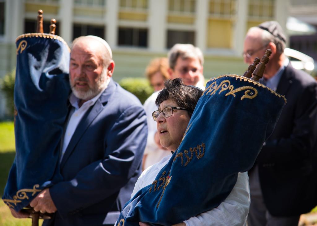 Rabbis Carolyn Braun, right, of Temple Beth El, and Gary Berenson of Etz Chaim Synagogue carry torahs Sunday from Portland’s Shaarey Tphiloh synagogue on Noyes Street to the congregation’s new home at Temple Beth El on Deering Avenue. The Noyes Street synagogue, which was deconsecrated and will become the home of Portland Community Squash, is moving into smaller quarters at Temple Beth El. Shaarey Tphiloh was founded in 1904 on Newbury Street. (Dan D’Ippolito / For The Forecaster)