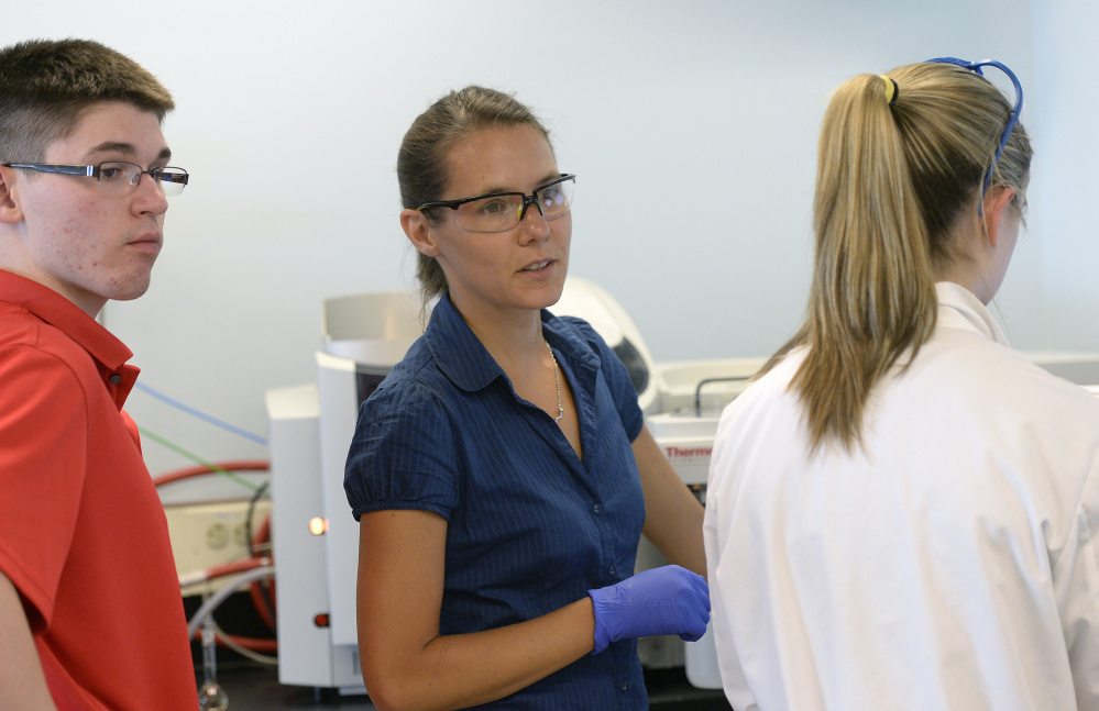 Professor Lucille Benedict, center, works with students in the beer lab at USM. Classes for brewers this fall will focus on how beer can get contaminated during the brewing process.