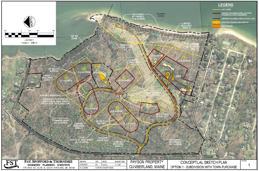 This visual shows Bateman Partners’ lot development layout on the former Payson property. The Payson mansion stands on 9.3-acre Lot 9. The town of Cumberland’s portion comprises 11 acres along Casco Bay including 2,200 feet of shorefront, as well as 9 acres along Foreside Road and a road – located right of center – that connects the two parcels.
