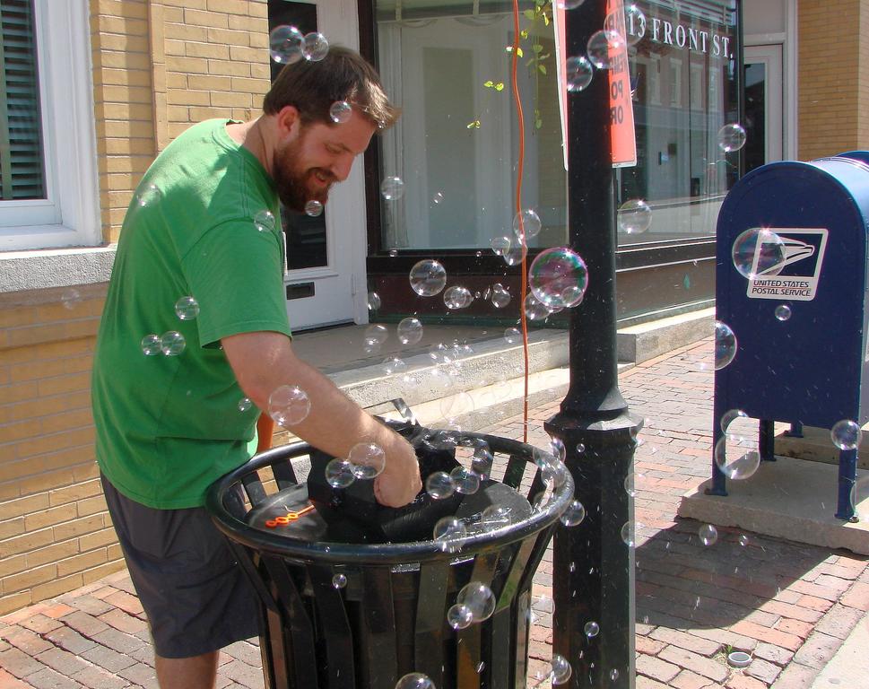 Bath Planning Director Andrew Deci tries out a bubble-making machine during the city’s Aug. 28 Open Streets event.