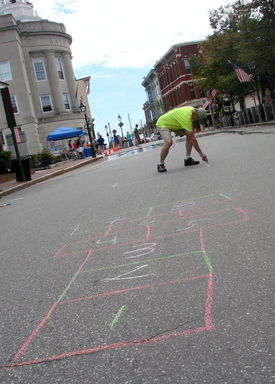 “Bath has 600 acres of public streets; it’s the second-biggest park we have,” Bicycle and Pedestrian Committee member Robert McChesney said Sunday as he chalked a hopscotch course on the pavement. “And it’s nice to give it over to other things besides cars.”