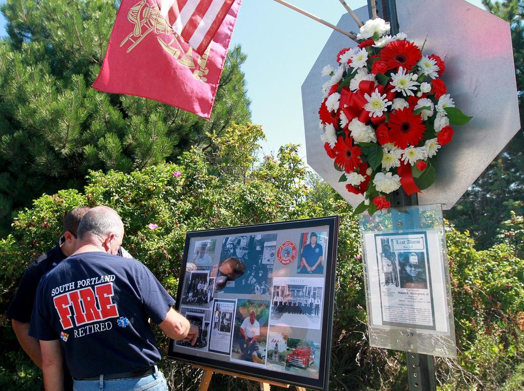 South Portland Fire Department Capt. Robb Couture pauses for a moment of silence Aug. 27 to honor fallen Capt. Robert Wallingford on the 20th anniversary of Wallingford’s death in the line of duty at the Portland Welding Co. fire in 1996. The ceremony took place on Madison Street, off Wallingford Drive, which was named in Wallingford’s honor after his death. (Melanie Sochan / For The Forecaster)