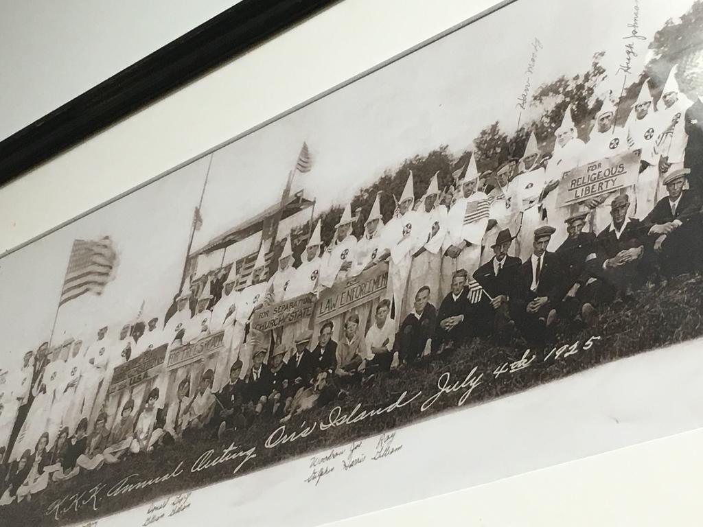 A photo of the Orr’s Island chapter of the Ku Klux Klan hanging in the Maine history room in the island’s library; the chapter existed from 1920-30. Bill Cotter, who grew up on the island, remembered the presence of the Klan during a Sept. 1 talk.