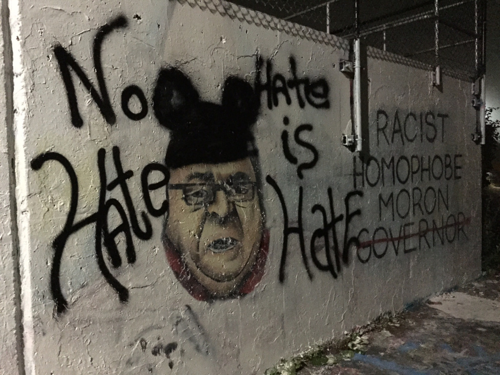 The graffiti appeared sometime in the past week near the Eastern Promenade Trail, on a wall that has been open to artists for more than a decade. The image of LePage appeared next to the words “racism,” “homophobe” and “moron.” The last word, “governor,” is crossed out with a red line of paint. The message “Dump LePage” is also written across the entire 100-foot-long wall. The work is not signed.