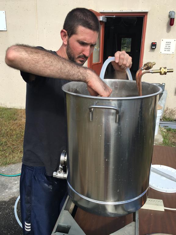 Jared Entwistle brews a pilot batch of IPA outside of the former small-arms shooting range at Brunswick Landing where Flight Deck Brewing will open early in 2017. Entwistle is leaving Portland’s Shipyard Brewing Co. to co-found Flight Deck.