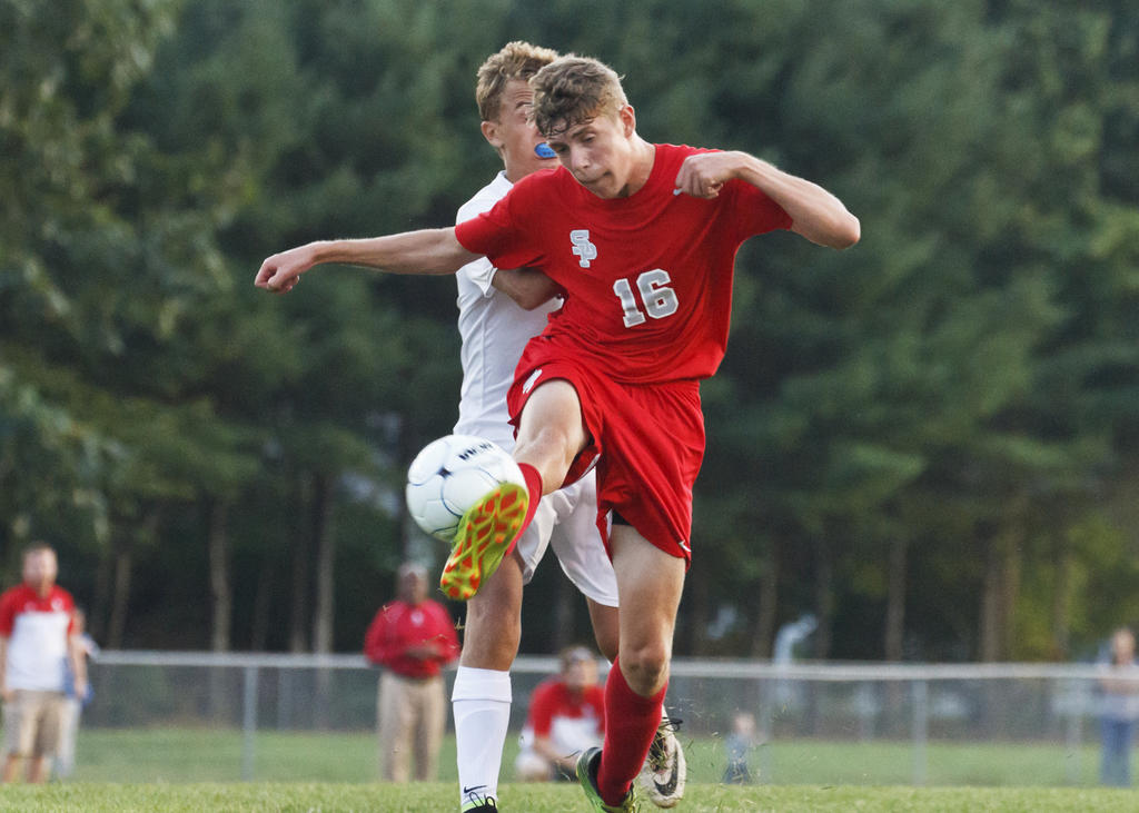 Cooper Mehlhorn of South Portland and Andrew Rent of Gorham clash at midfield.