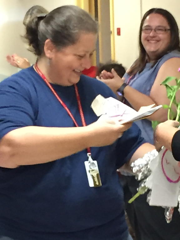 Laura Stevens, the second-grade teacher at Kaler Elementary School in South Portland who recently won the Presidential Award for Excellence in Mathematics and Science Teaching, was honored with a surprise celebration ceremony at the school Monday morning. Banners on the front of the building and inside the building greeted Stevens, following her return from Washington, D.C., to collect her teaching honor. The entire school lined the hallways and cheered for her as she made her way to the lobby. One student from each classroom handed her a flower as Stevens made her way through the halls.
