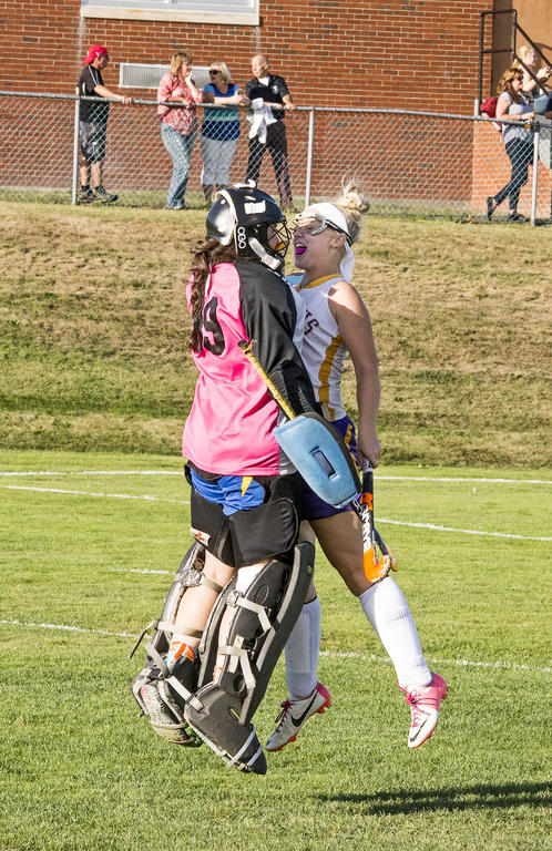 Cheverus junior goalie Kat Kane and junior Anna Smith celebrate after one of the Stags’ eight goals in Wednesday’s 8-0 home win over Portland.
