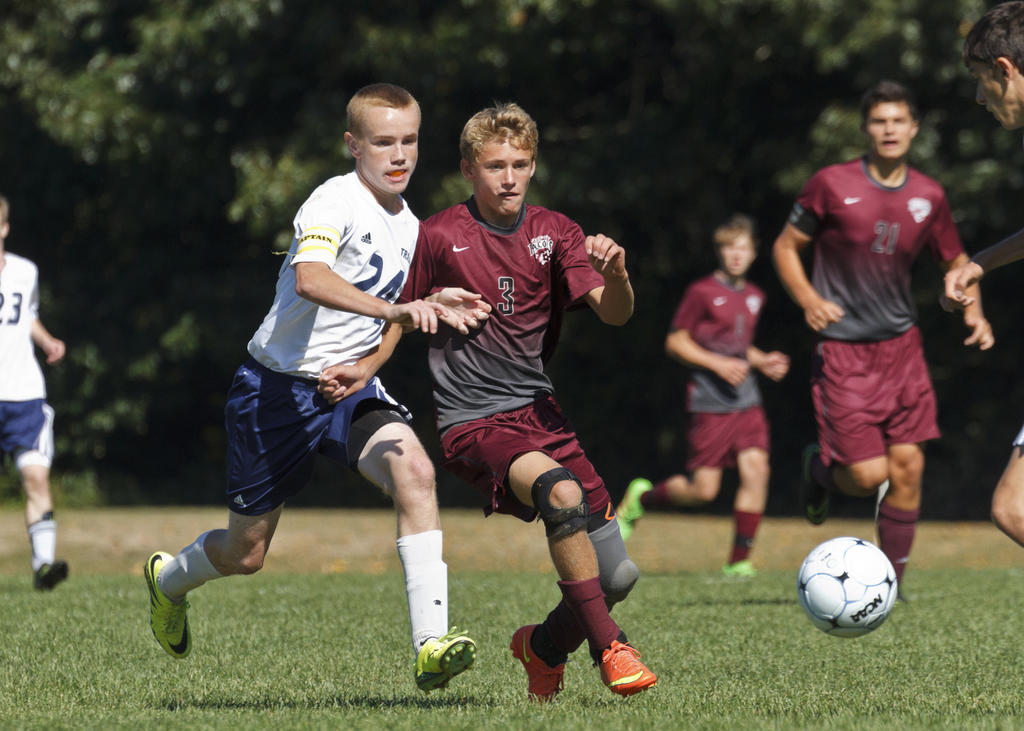 Traipster Andrew Macomber shoulders into Freeporter Eriksen Shea as both boys pursue the ball.