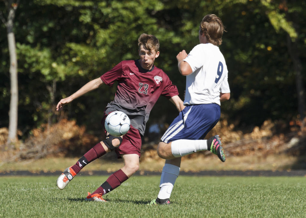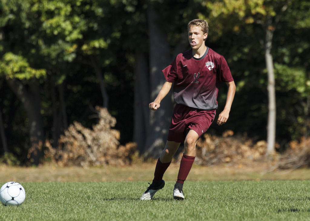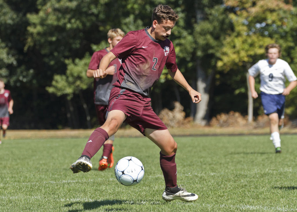 Freeport’s Caleb Arsenault shuttles a pass cross-field.