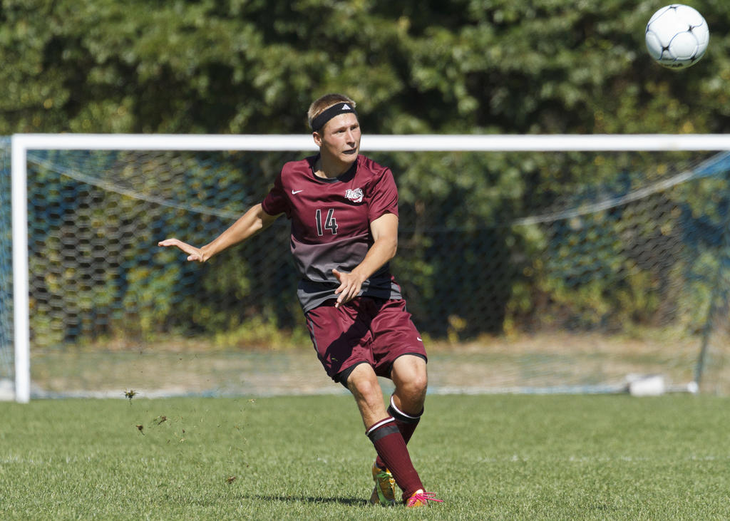 Colby Wagner heads a ball toward the Traip cage; the shot would beat Rangers keeper Jayce Neilsen for Wagner’s second header-goal of the day.
