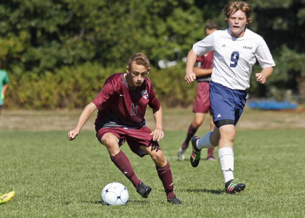 Freeport’s Ben Morang takes a touch as a Traip opponent descends on his position.