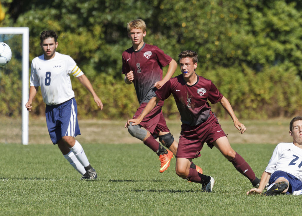 The Falcons controlled for much of game, pressing their attack often. They lit the lamp early when Josh Spaulding one-timed a midair cross on its way in from wide-right. Traip keeper Jayce Neilsen never had a chance. 1-0.