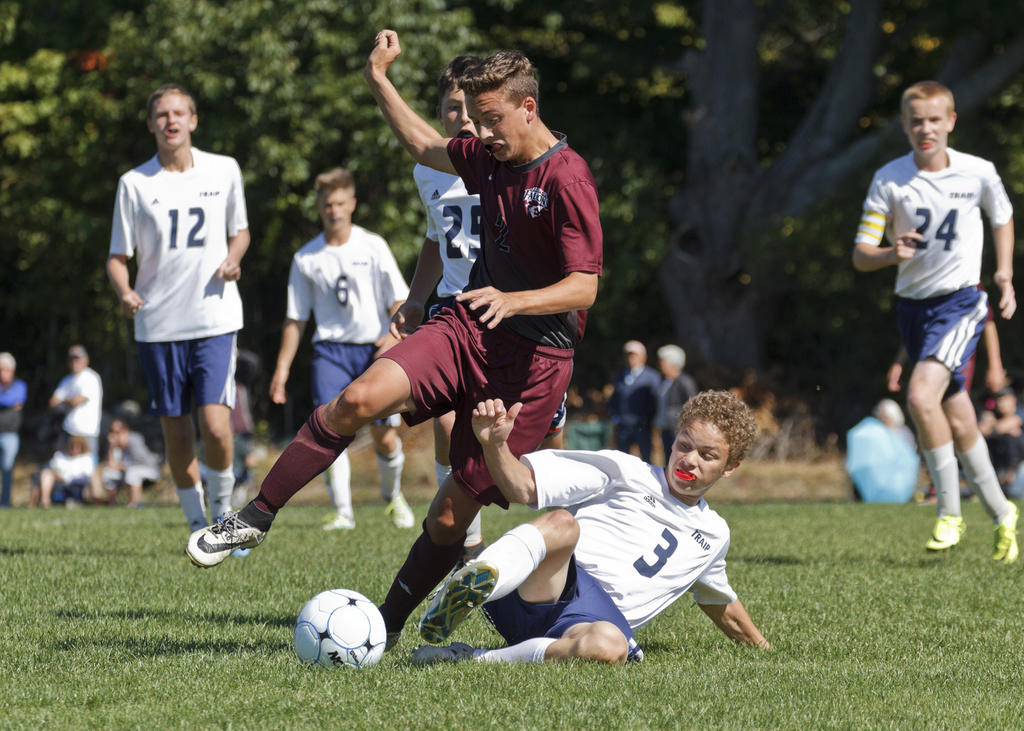 Freeport’s Joe Ashby leaves a Traip opponent lying in the grass as he blasts the ball away.