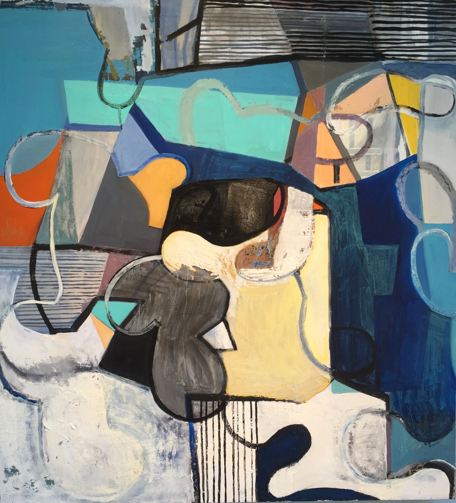 Jennifer Moses’s rhythmically playful abstractions engage broadly, such as her 2014 “Who’s afraid of red, yellow, blue?” which riffs on Barnet Newman’s 1966-70 Mondrian-referencing paintings whose titles looked to Edward Albee’s 1962 “Who’s Afraid of Virginia Woolf?” On the opposite spectrum are Grant Drumheller’s warmly unironic landscapes of place, such as his large Eliot, Maine, orchard of golden apples, or his smaller and pleasantly clucky and plucky horizonless “Bird Walk.”