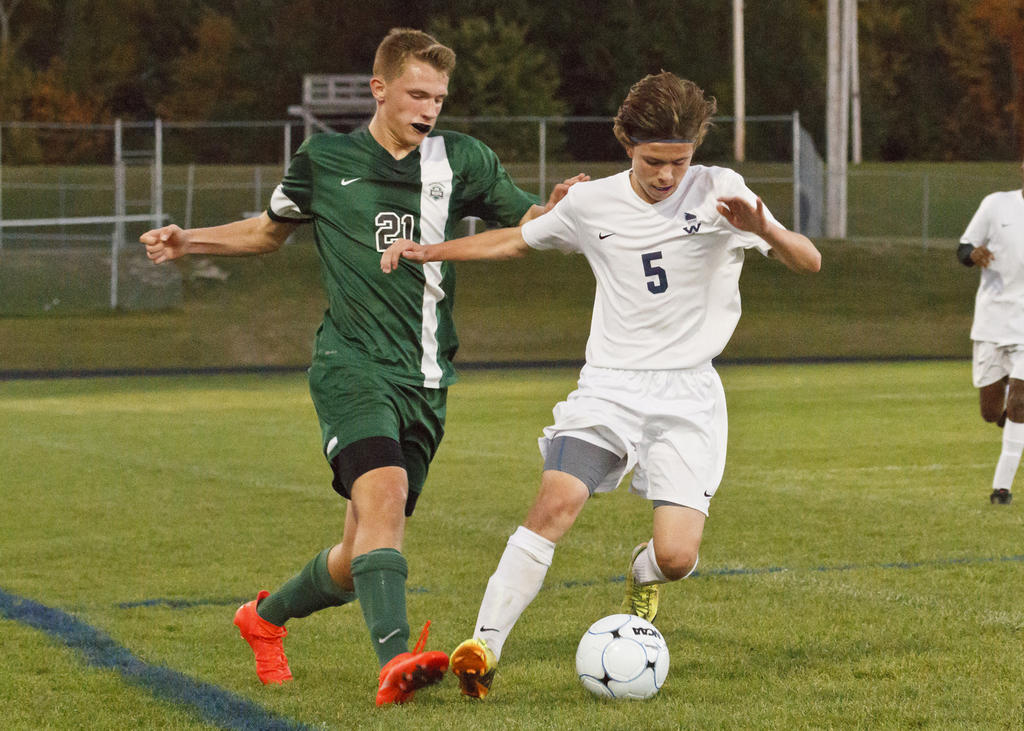 Westrbrook’s Caleb Barlow puts himself between a Bonny Eagle opponent and the ball.