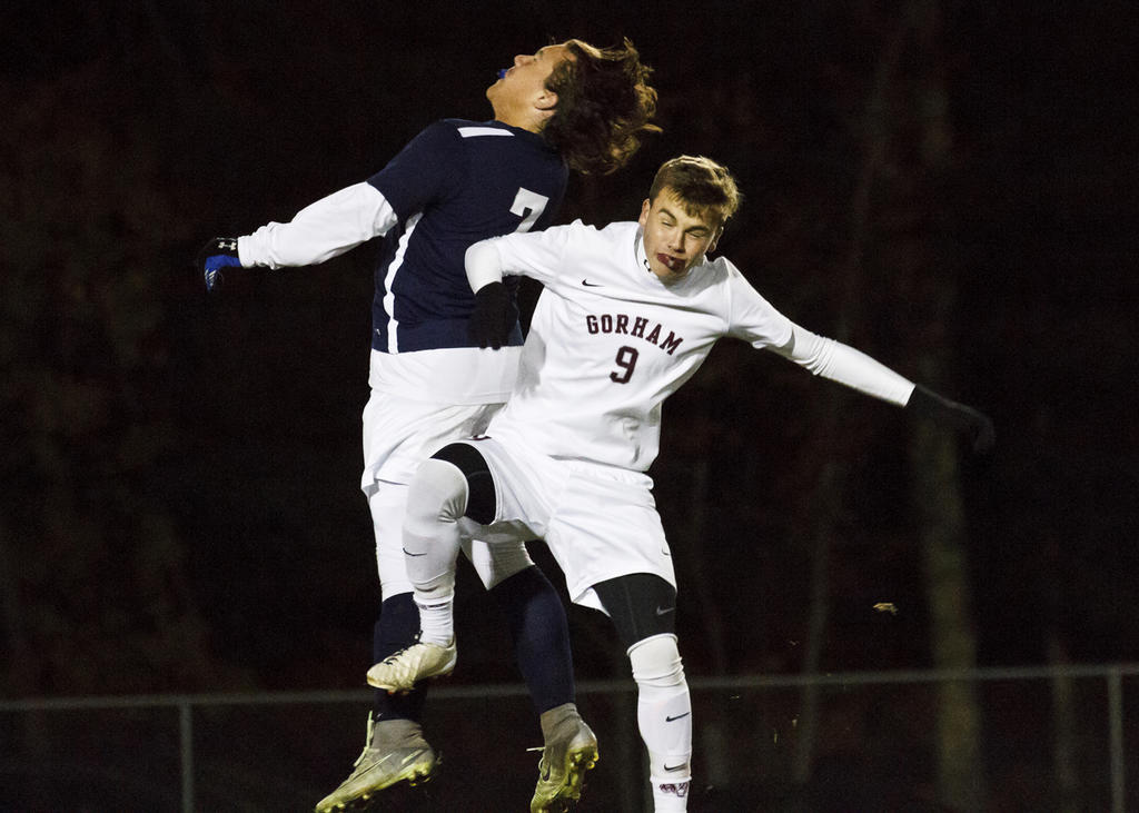 Westbrook’s Grayson Post and Gorham’s Jackson Fotter collide in midair.