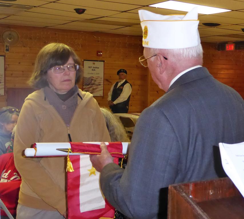 Lydia Clark of Westbrook, widow of Staff Sgt. Craig Cherry, formerly of Windham, receives a Gold Star banner Oct. 15 from American Legion Cdr. Peter Johnson. Cherry was killed in Afghanistan in 2004. At the ceremony at the American Legion Memorial Post 155 in Naples, presentations were made to families of military service membrs were in killed in action in Afghanistan and Iraq after 2001. The ceremony was sponsored jointly by the American Legion Field-Allen Post 148 of Windham and the Naples post. The Gold Star Banner replaces the Blue Star Banner and is given when a serviceman loses his life during conflict.