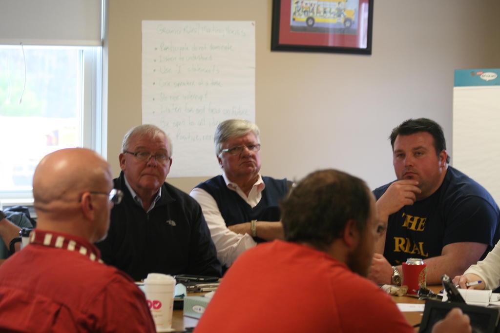 From left, Gary Donohue, James Moses and Jake Stoddard at a meeting of members of the Frye Island Board of Selectmen and the School Administrative District 6 Board of Directors in May. Members of the district’s cost share committee rejected a proposed change to the cost-share formula, ending discussions of re-distributing costs for each of the district’s five towns.