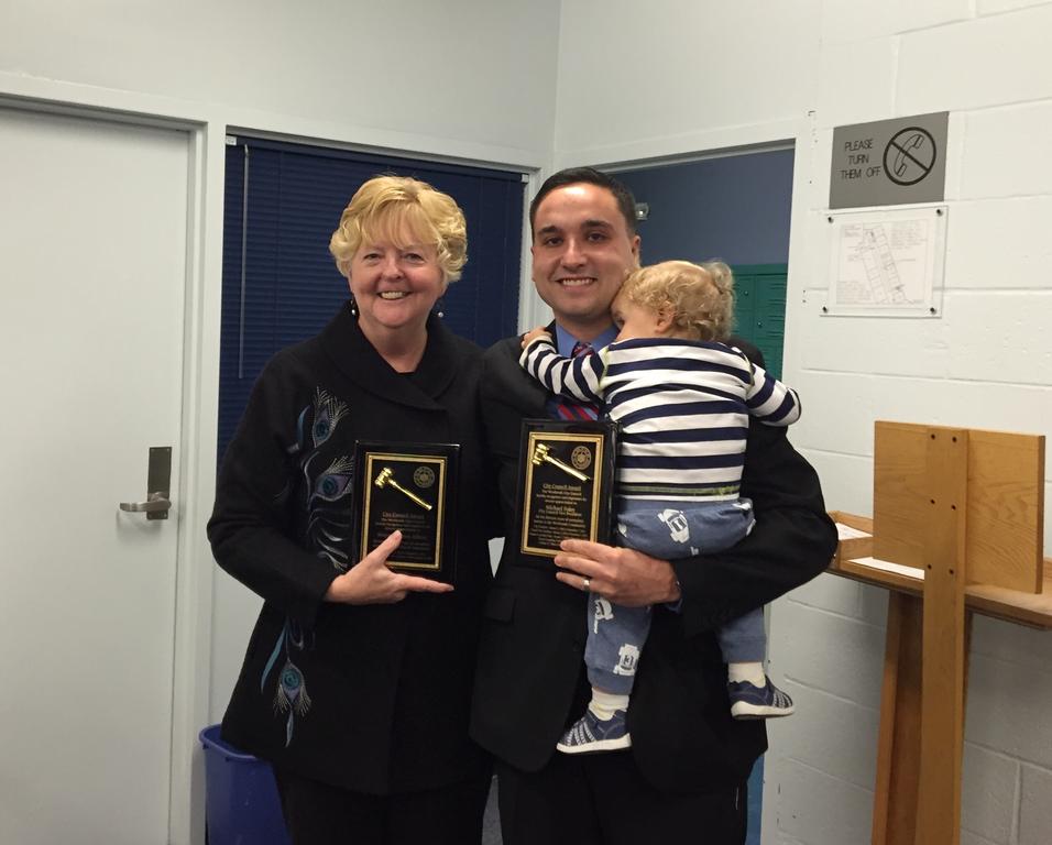 Mayor Colleen Hilton and Councilor Michael Foley pose with plaques handed out Monday in appreciation of their years of service to Westbrook. Hilton is stepping away after seven years as mayor and 10 years on the School Committee. Foley has been a City Councilor since 2005. Also pictured is Foley’s son, Joseph.