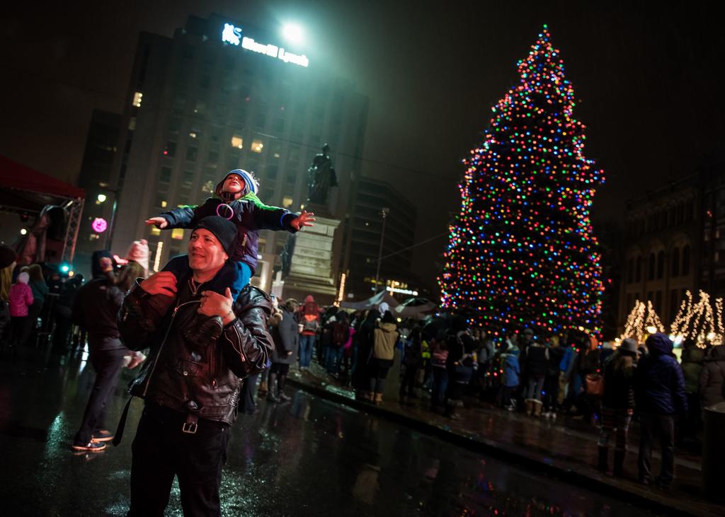 Jeffrey Blood and his son Miles, 3, of Westfield, Massachusetts, stand in front of the Portland Christmas tree moments after it was lit Friday, Nov. 25, in Monument Square. (Dan D’Ippolito / For The Forecaster)