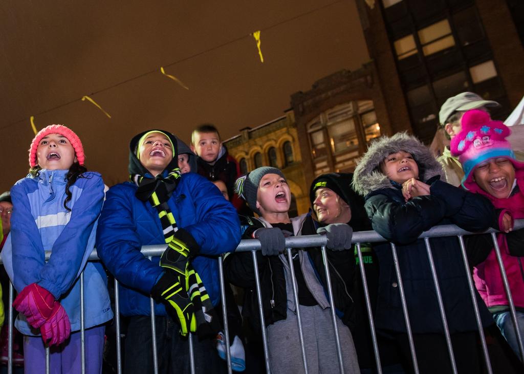 A steady rain couldn’t dampen the holiday spirits of kids singing along with singer-songwriter Rick Charette at the Portland tree lighting in Monument Square on Nov. 25. (Dan D’Ippolito / For The Forecaster)