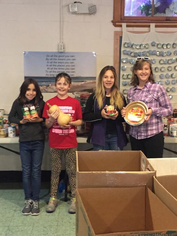 Lillian Bouchard, left, Elara Kluck, Caroline Bolk and Cady Kluck were among the young volunteers who helped with Thanksgiving baskets at Raymond Village Community Church.