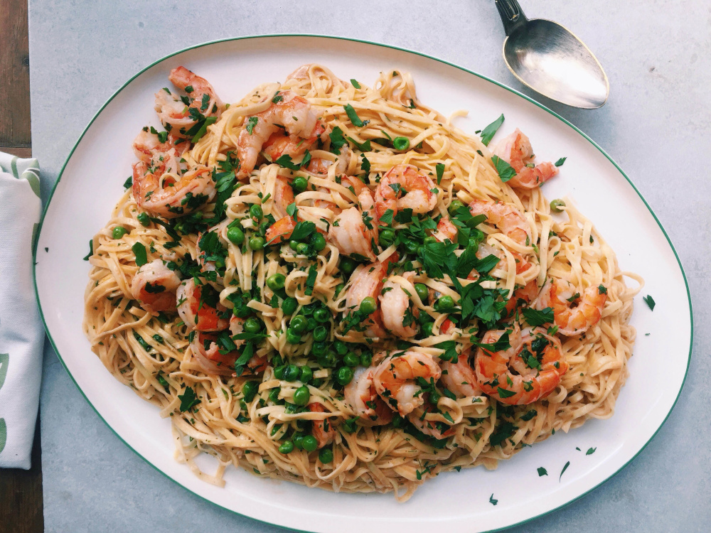 FRESH LINGUINE WITH SHRIMP AND PEAS IN A PINK CREAM SAUCE
