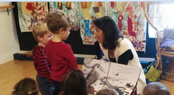 Maine author Melissa Kim reads from her book, “A Snowy Owl Story,” that was published under a partnership with Maine Audubon.
