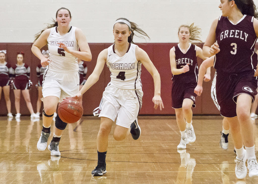 Gorhamite Kaylea Lundin escapes Greely defender Moira Train and makes for the lane.