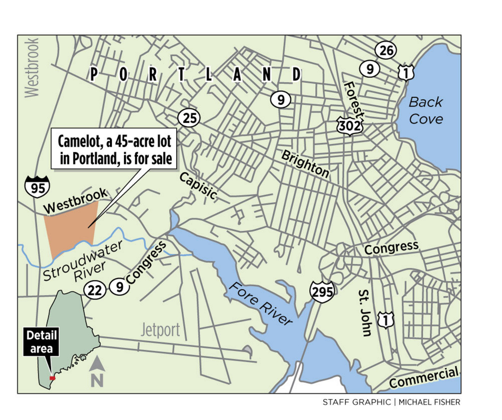 Located on Portland’s western edge near the Maine Turnpike, the Camelot property is considered the largest undeveloped residential lot in the city. It currently features a sprawling, single-story ranch house – built by Peter and Mary Rogers in 1961 to accommodate their 11 children – and 45 acres of hilly pasture land plus 1,500 feet of frontage along the Stroudwater River.