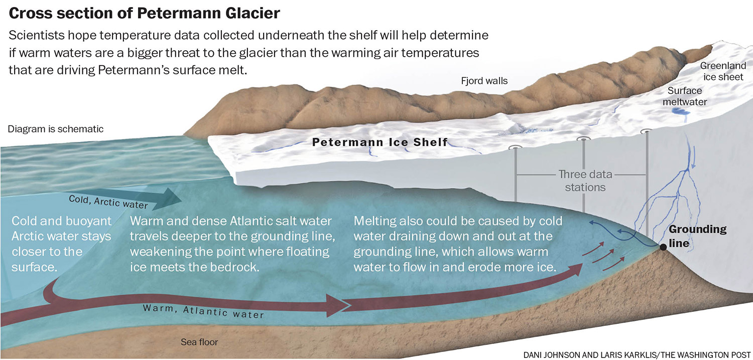 A sensor in 3,000-foot-deep waters had found that in the warm, salty Atlantic layer, temperatures were even warmer than just a year earlier, in 2015. Those waters are likely flowing toward Petermann glacier’s grounding line and helping to melt the shelf from below.