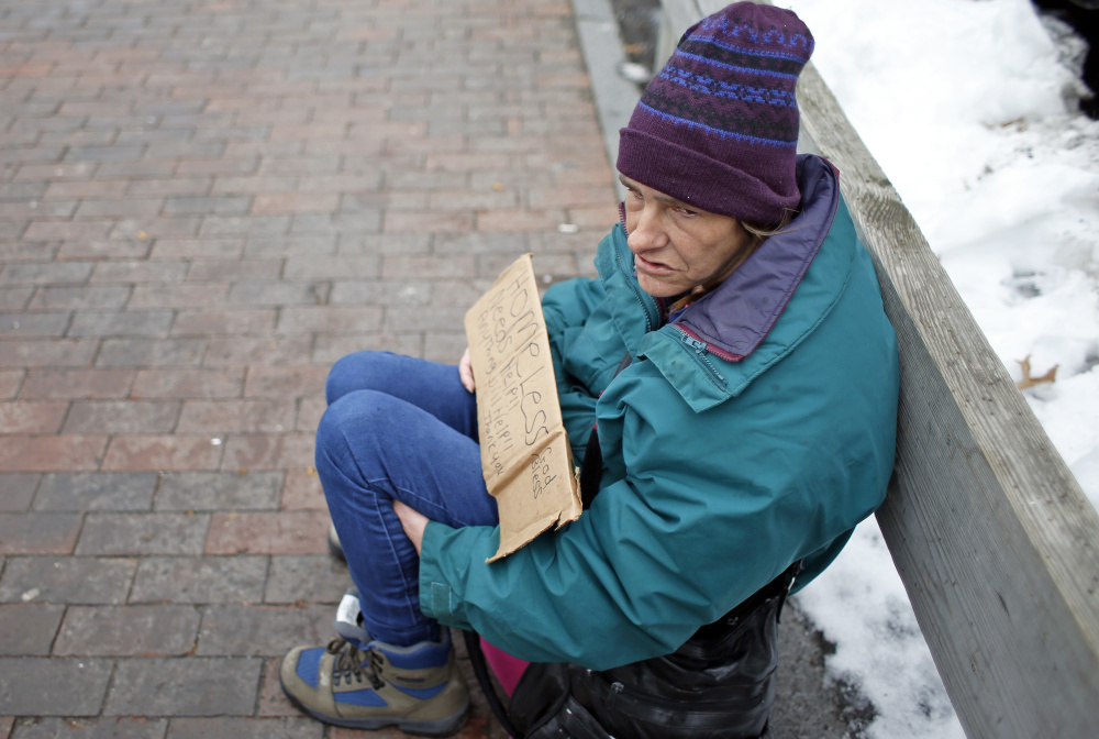 Michelle Brooks was sitting on a Commercial Street sidewalk next to Bill’s Pizza on Tuesday afternoon, quietly holding a sign that read, “Homeless. Needs Help. Anything helps. God bless.” The 48-year-old says she lets her sign do all of the talking, although she does thank people who donate.
