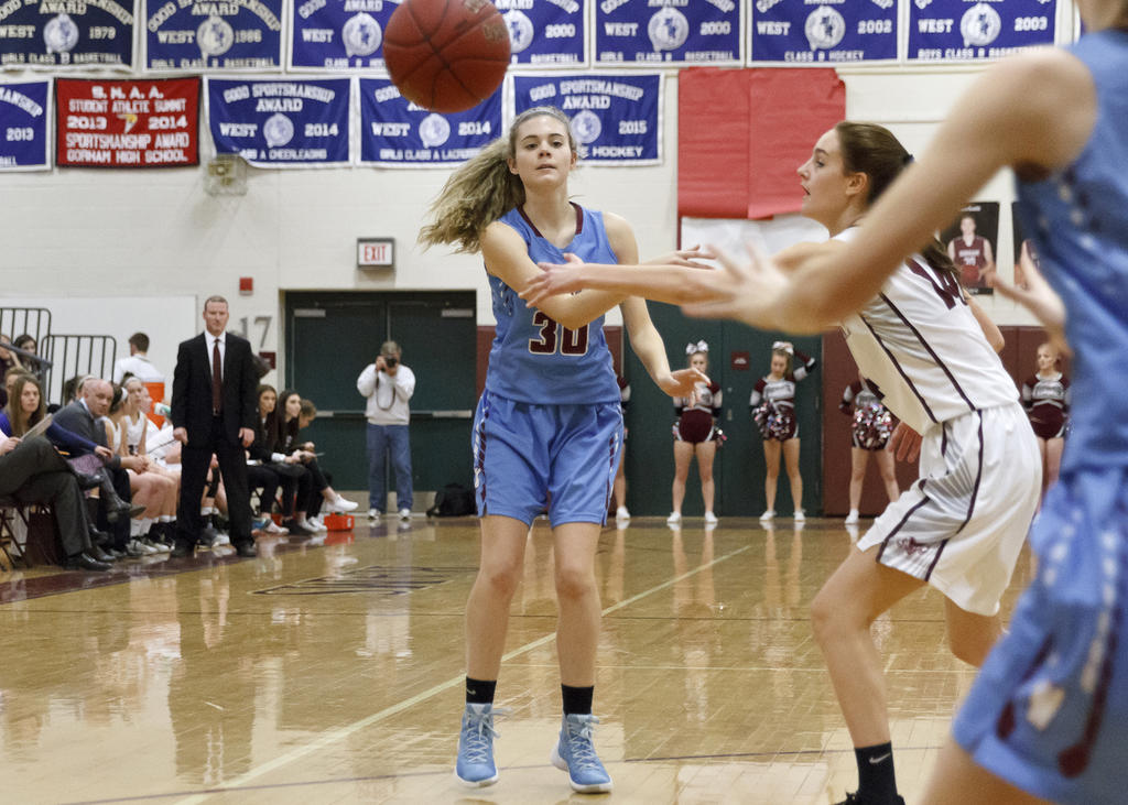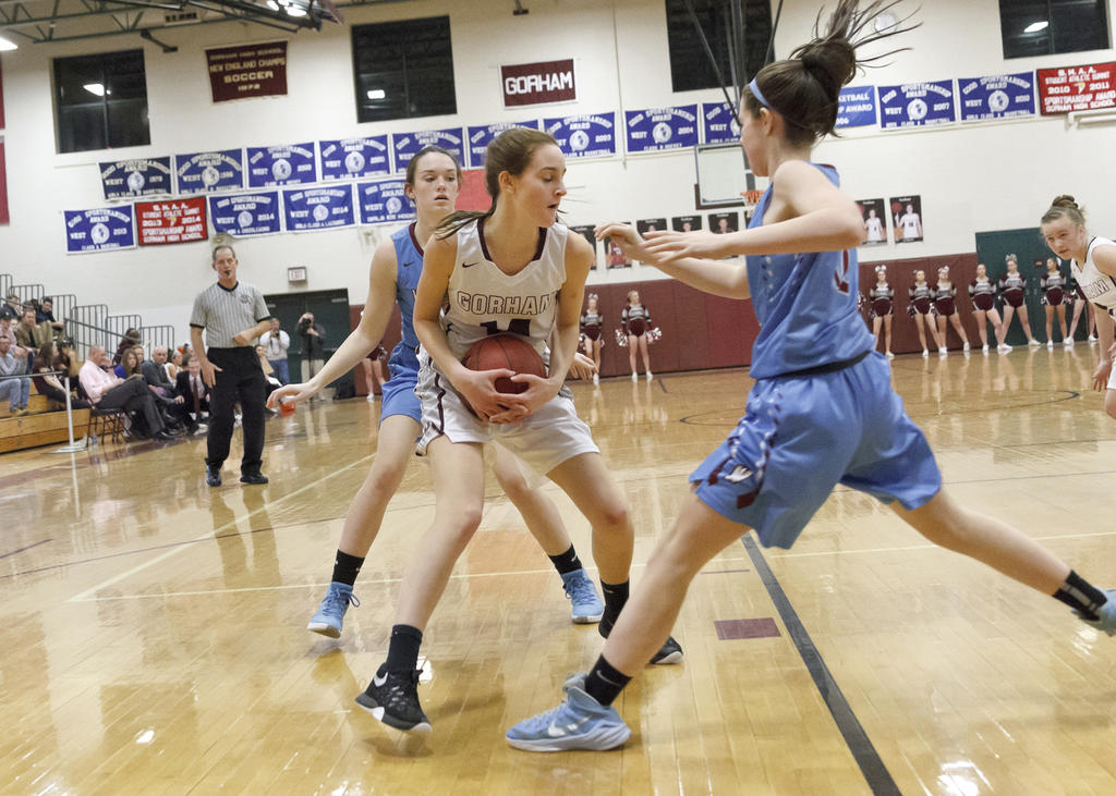 Hannah Talon works through the paint, defended by Gorham’s Courtney Brent.
