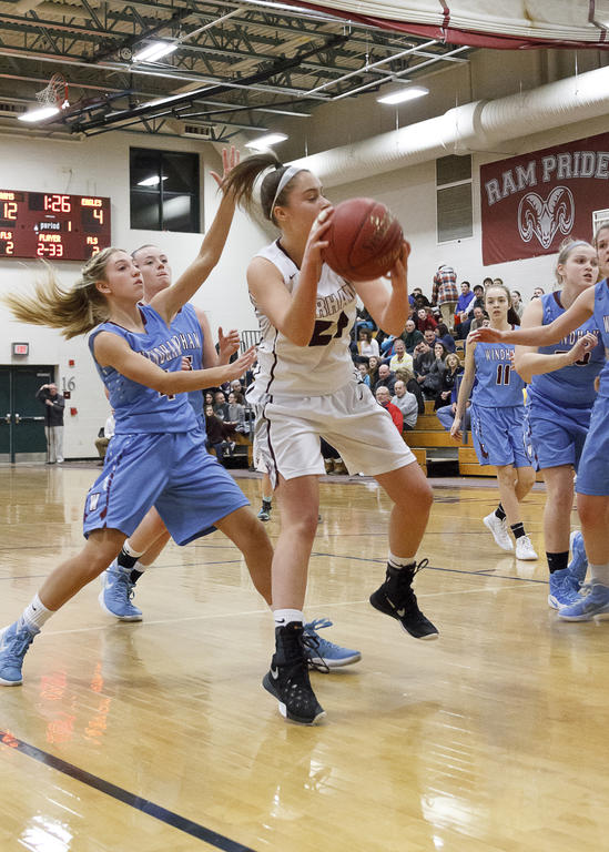 GORHAM – Emily Esposito racked up 23 vs. visiting Windham on Friday night, Jan. 6, leading the Rams in routing the Eagles while also setting a new school record for points in a career. Sophomore teammate and fellow powerhouse Mackenzie Holmes trailed Esposito closely in the bout: Holmes tallied 20 in the 69-32 victory.
