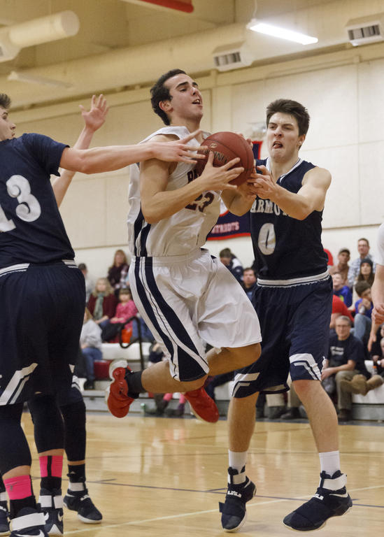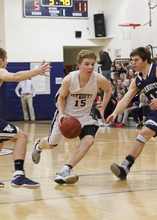 Patriot Tanner Mann sidles into the key on the offensive vs. visiting Yarmouth on Tuesday night.